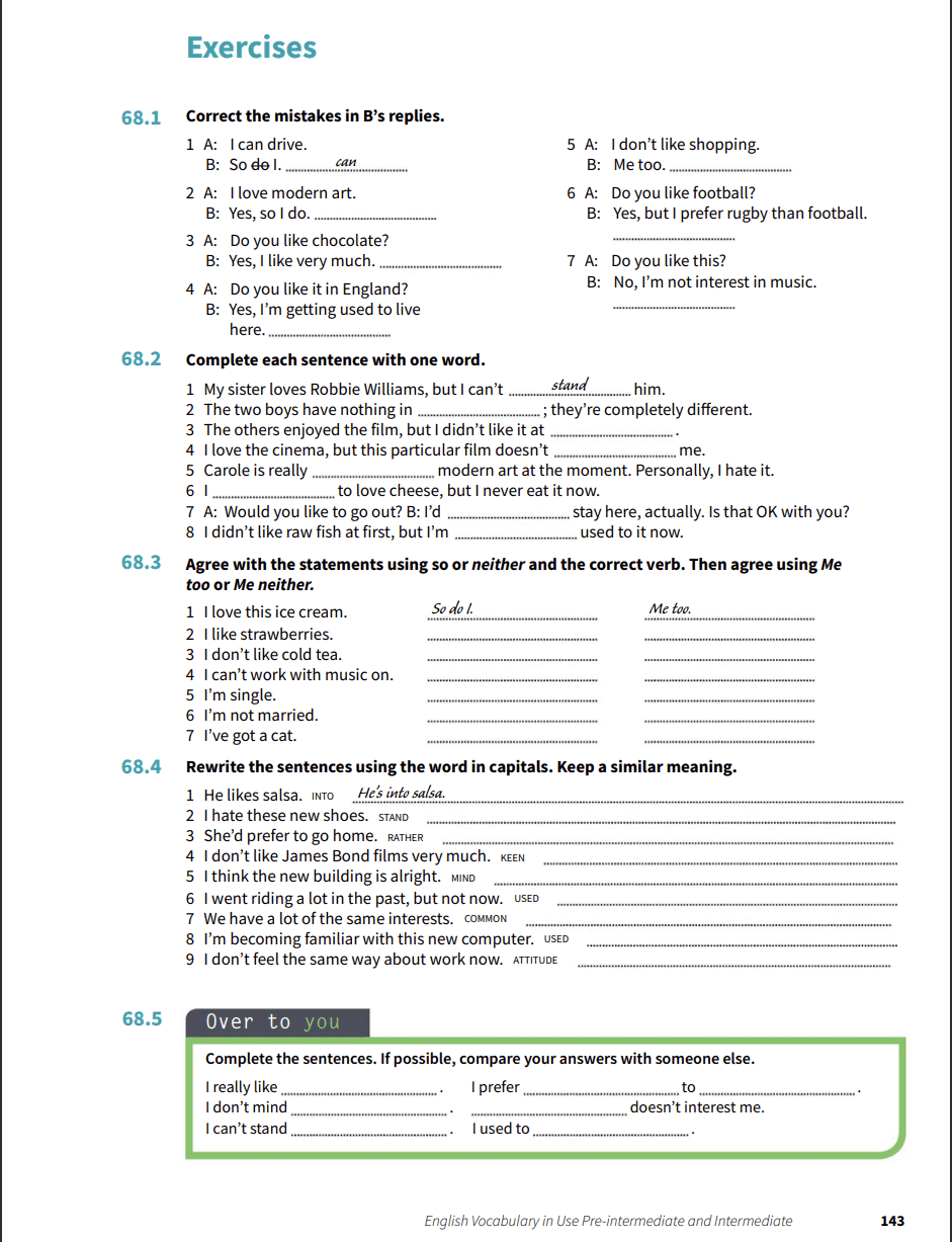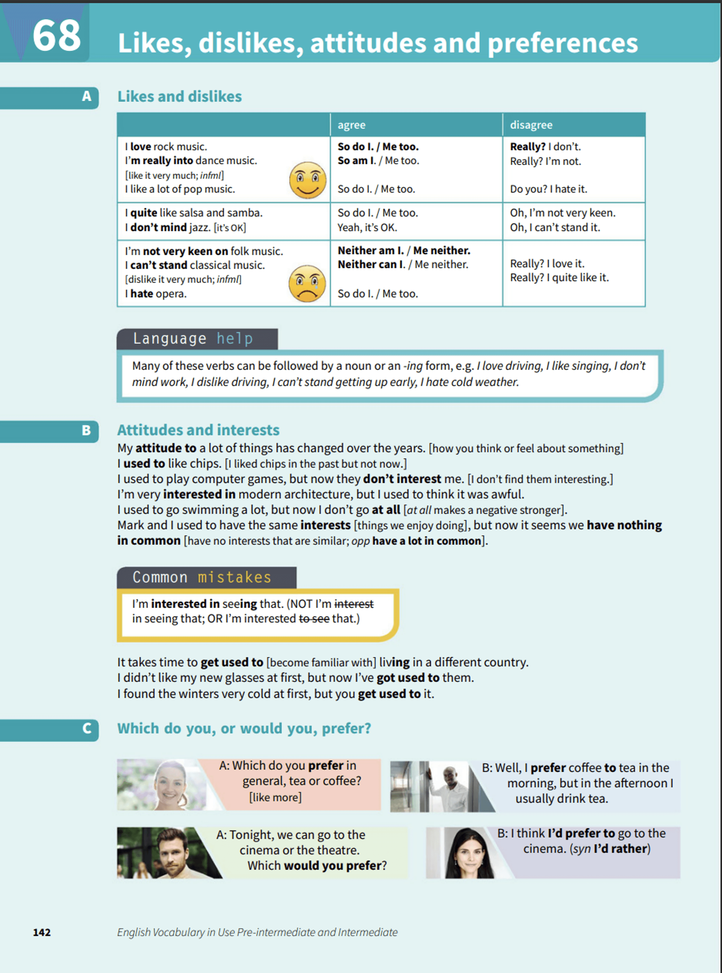 Further Practice: To practice more on likes and dislikes, you can download the following lesson on expressing likes, dislikes, attitudes and preferences from Cambridge's English Vocabulary in Use Pre-intermediate & Intermediate to learn and practice with more structures.