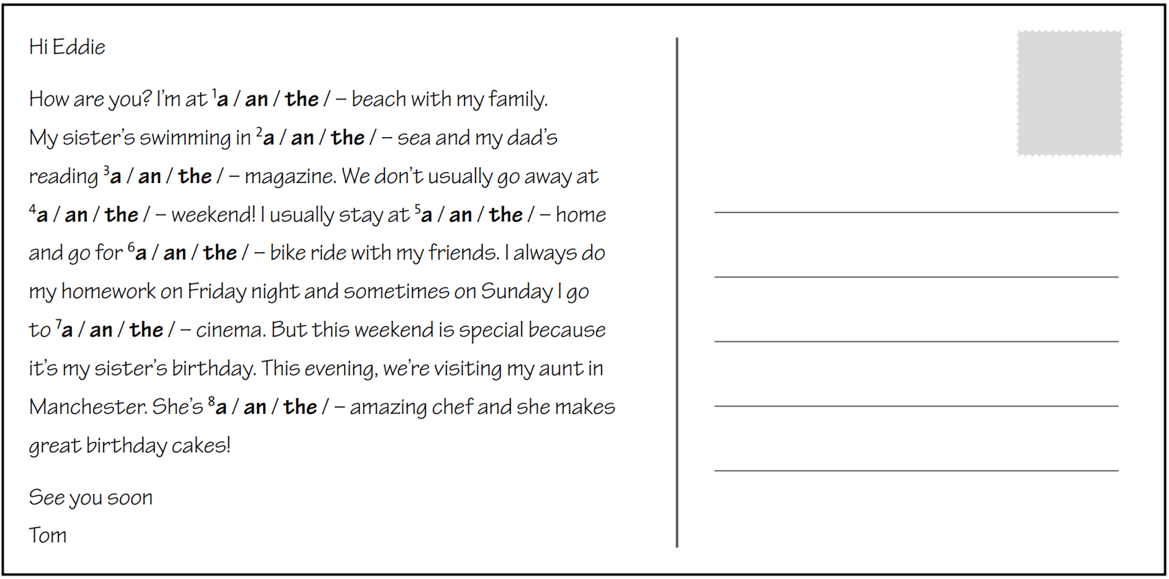 Task 2: Read the postcard again. Try to memorise the details. You have one minute!